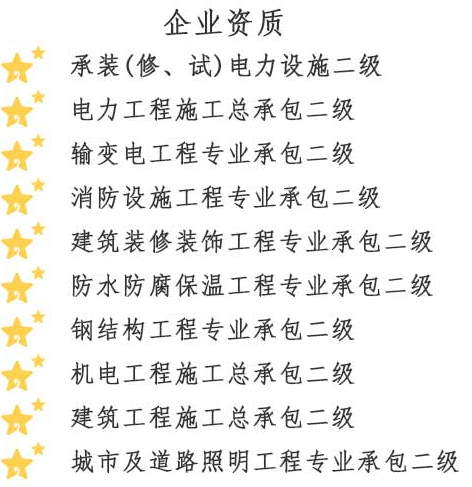 金楓電力集團(tuán)有限公司,成立于2015年5月28日,注冊資金6060萬元,是一家專業(yè)從事電力工程施工的集團(tuán)化公司。公司經(jīng)營范圍包括:電氣安裝服務(wù);建設(shè)工程施工;輸電、供電、受電電力設(shè)施的安裝、維修和試驗;測繪服務(wù);建筑勞務(wù)分包;建筑工程設(shè)計;發(fā)電機及發(fā)電機組制造;建筑工程機械與設(shè)備租賃;工業(yè)工程設(shè)計服務(wù);技術(shù)服務(wù)、技術(shù)開發(fā)、技術(shù)咨詢、技術(shù)交流、技術(shù)轉(zhuǎn)讓、技術(shù)推廣等。公司持有國家能源局頒發(fā)的承裝(修、試)電力設(shè)施許可證,承裝類二級、承修類二級、承試類二級資質(zhì);電力工程施工總承包二級資質(zhì);輸變電工程專業(yè)承包二級資質(zhì);建筑裝修裝飾工程專業(yè)承包二級資質(zhì);消防設(shè)施工程專業(yè)承包二級資質(zhì);防水防腐保溫工程專業(yè)承包二級資質(zhì);施工勞務(wù)資質(zhì);機電工程施工總承包二級;建筑工程施工總承包二級;城市及道路照明工程專業(yè)承包二級;鋼結(jié)構(gòu)工程專業(yè)承包二級資質(zhì);公司已通過質(zhì)量管理體系認(rèn)證、環(huán)境管理體系認(rèn)證及職業(yè)健康安全管理體系認(rèn)證。并獲得省級信用評價AAA證書;連續(xù)多年納稅信用評價A級。